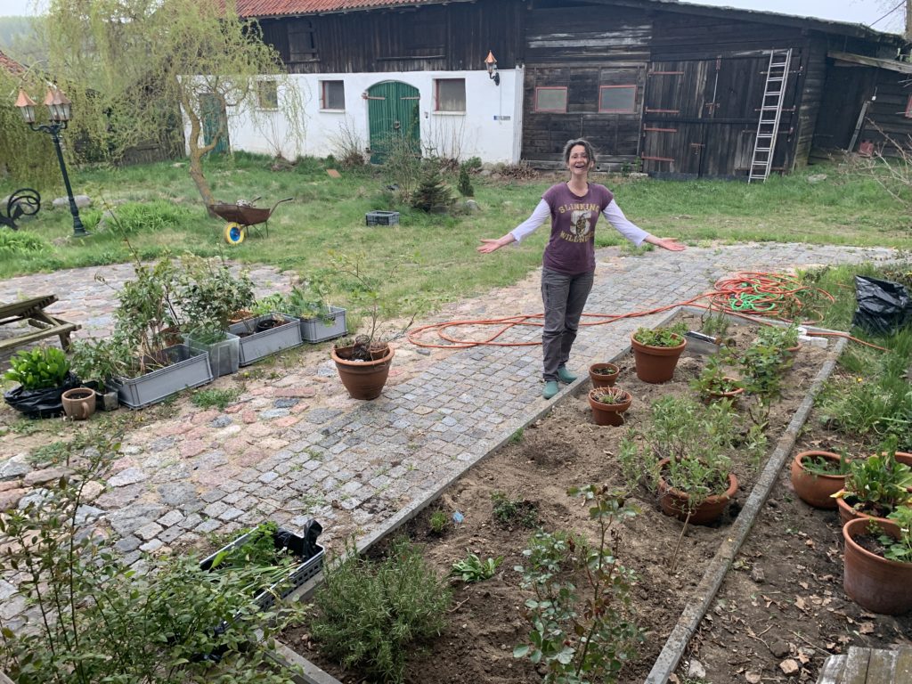 Steffi gerät unter maximale Erledigungsnot zur Einbringung der importierten Gewächse in masurischen Boden. So sind wir dabei, in archaischer Ackerbaukunst mit der Hände Kraft und AUSDAUER unter der Krume befindliches Steingut und Wurzelwerk zu bergen. Und zwar in Bergen. Und zwar in Tagen. Und zwar mit Null Bock. Nun ist das Kräuterbeet fertig, aber das Areälchen neben der Bar trotzt meiner wutentbrannten Einlassung mit Spaten, Stemmeisen, Axt und Kettensäge der furchtbaren Robinie und deren Artgenossen beizukommen. Gekrönt von 2 Tonnen wunderschönen Gesteins im Dornröschenschlaf 15 cm unter der unansenlichen Oberfläche. Hab ich das nötig? Ja, offensichtlich. Dort werden demnächst Tomaten und farbenfrohes Ziergut eine Heimat finden.