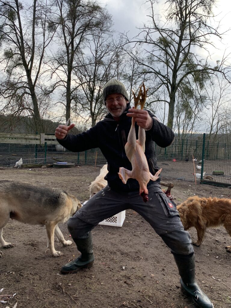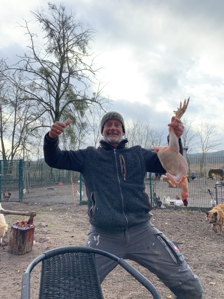 Ich habe mich, gestresst wie bei einem date, so dermassen dämlich angestellt, das Beil zackig durch den Hals des Gockels zu treiben, dass Georg übernehmen musste. Nun gut, beim nächsten Mal wird es defintiver, also tiefer und treffsicherer. Aber das Rupfen ging dann gut von der Hand. Sieben geköpfte Hähne haben wir bearbeitet, herrlichstes, arschkaltes Wetter, nasse Buxe vom Abbrühwasser. Habe dann 2 Hähne á 2 Kilo mitgenommen. Fazit nach Beendigung des Suds : 6 Stunden Arbeit ….. Hat das was zu tun mit meiner bis dahin effizienzgesteuerten, wirtschaftlichkeitsgeilen Art der Alltagesbesschleunigung  ? Nein !!!!!!! Hätte mir bei dem Salär aus kassenärztlicher Tätigkeit den Gesamtbestsand an Hähnen eines ALDI- Nord Ladens, nebst 40 Säcken Garnelen ins Tiefkühlfach manövrieren können. Oder ein lebenslanges Abo an einer Garküche in Bangkok serviert und genachtischt von bezaubernden Schönheiten.