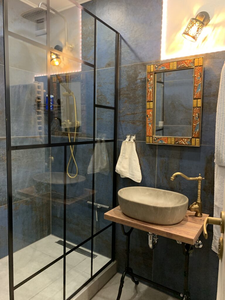 Ich habe das Bad oben fertigestellt, … was eine insgesamt scheiss Arbeit. Aber das Ergebnis ist anbietbar. Ich frohlocke beim nächtlichen Harndrang der kurzen Strecke zum Ablass.